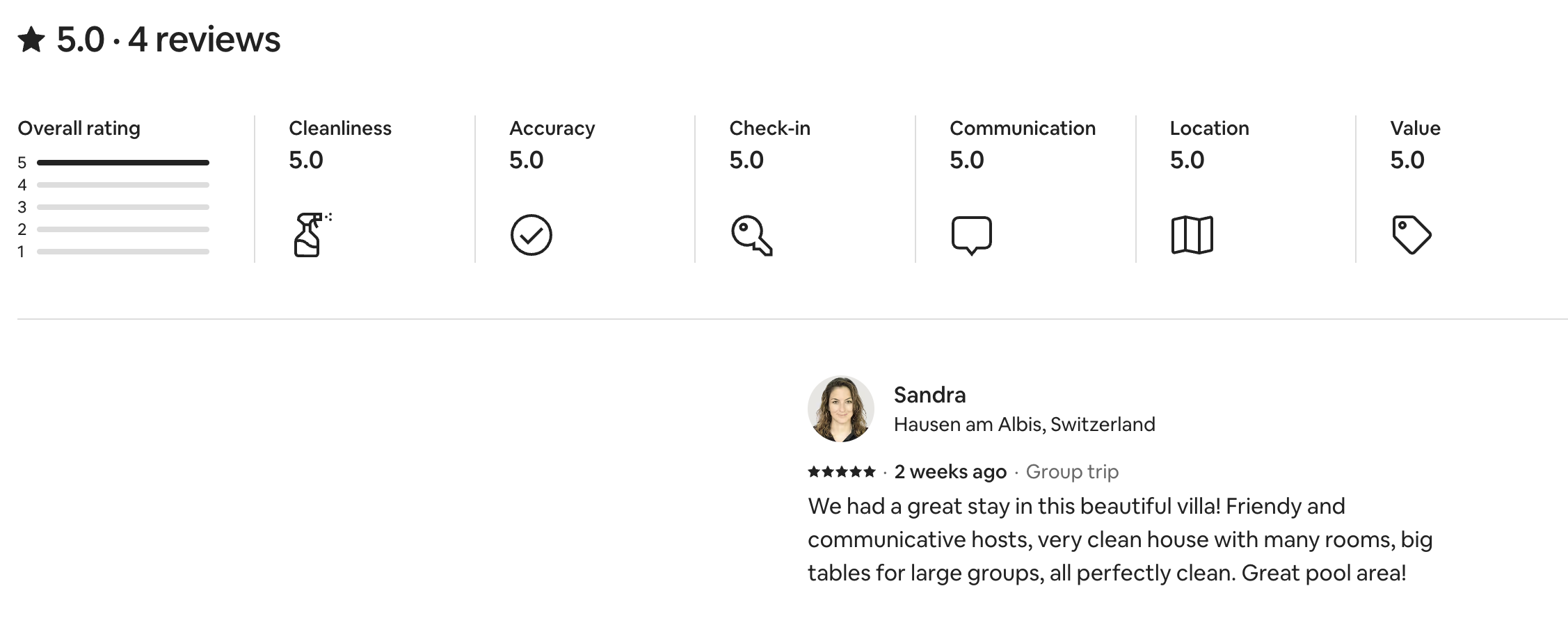 A very comfortable and stylish villa! We were a group of 14 family members, ranging in age from 5 to 78, and everyone had a wonderful time. The hosts were incredibly kind and helpful — even offering to drive one of us to the airport. A truly memorable family holiday.