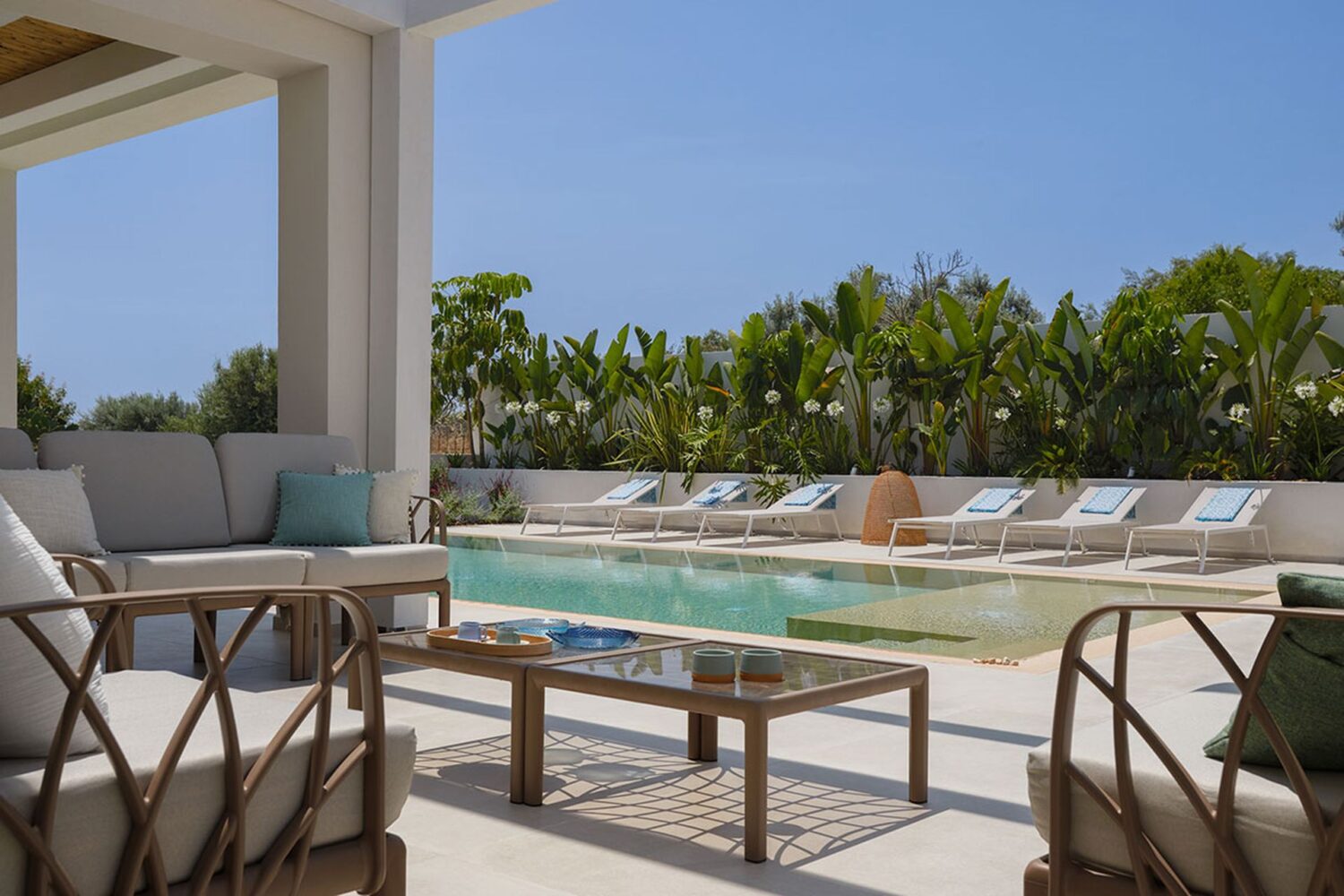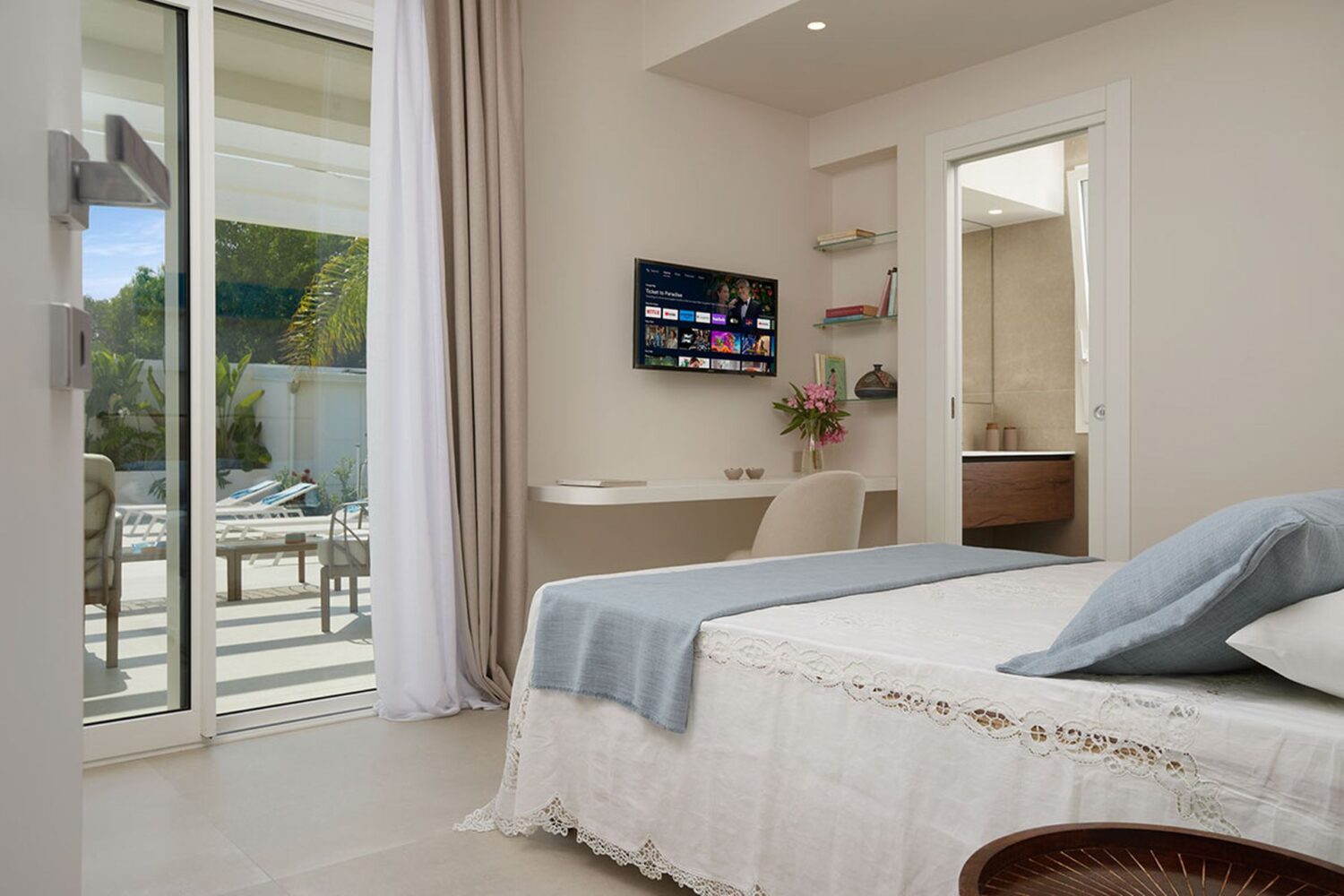 Ogni angolo di Azure Essence trasmette freschezza e luminosità. Il design contemporaneo, le linee pulite e i dettagli eleganti creano uno spazio accogliente in cui rilassarsi con stile. Le ampie vetrate a tutta altezza portano l’esterno all’interno, rendendo piscina e giardino parte integrante della quotidianità.