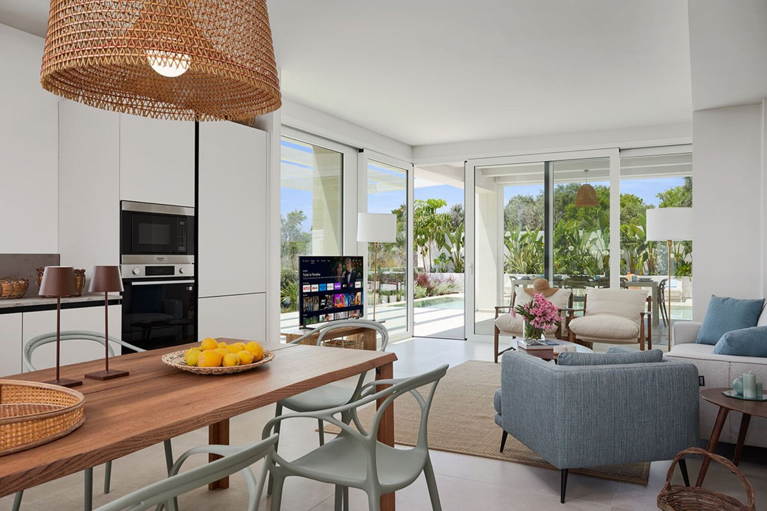Ampia zona living con cucina e soggiorno, caratterizzata da grandi porte a vetro che si aprono direttamente sulla piscina, creando un collegamento continuo tra interno ed esterno.
